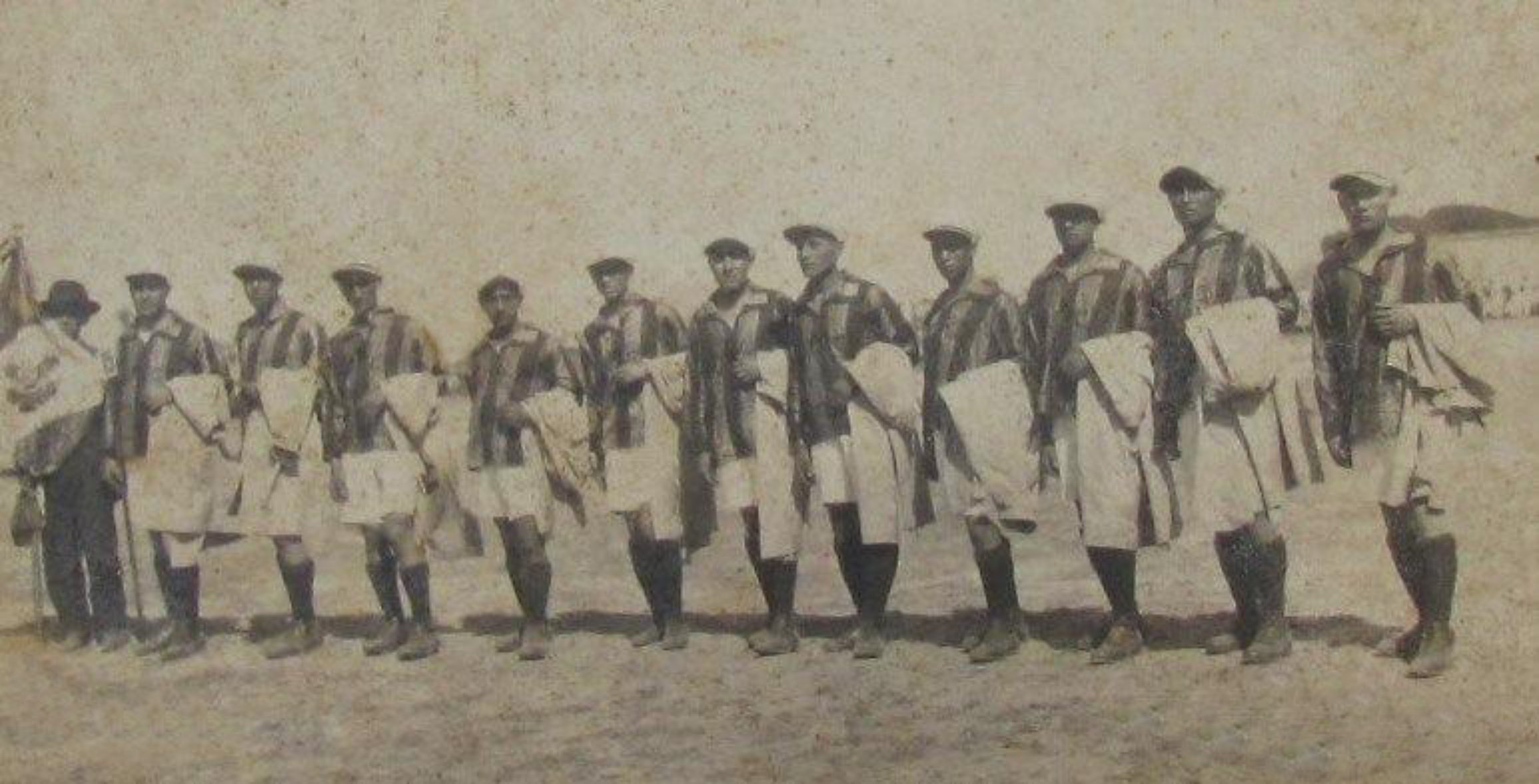 Primera generación de futbolistas del Club Unión Cartavio exhibiendo la Copa Frank Smith, disputada durante varios años.